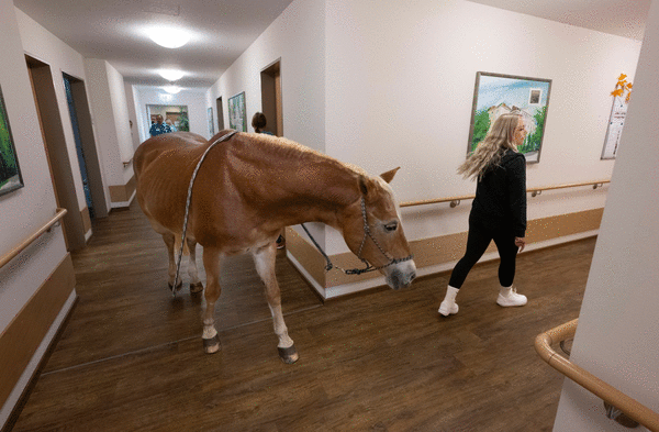 FRANKFURT, Germany — Wega carefully places her hooves on the dark laminate floor. Step by step, the small-statured Haflinger mare ventures into the foyer of the nursing home in Bückeburg in Lower Saxony, Germany.