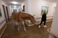 One by one, Plassmeier directs the horse around the room. Nobody backs away from the large animal. Wega is repeatedly given treats and stroked.